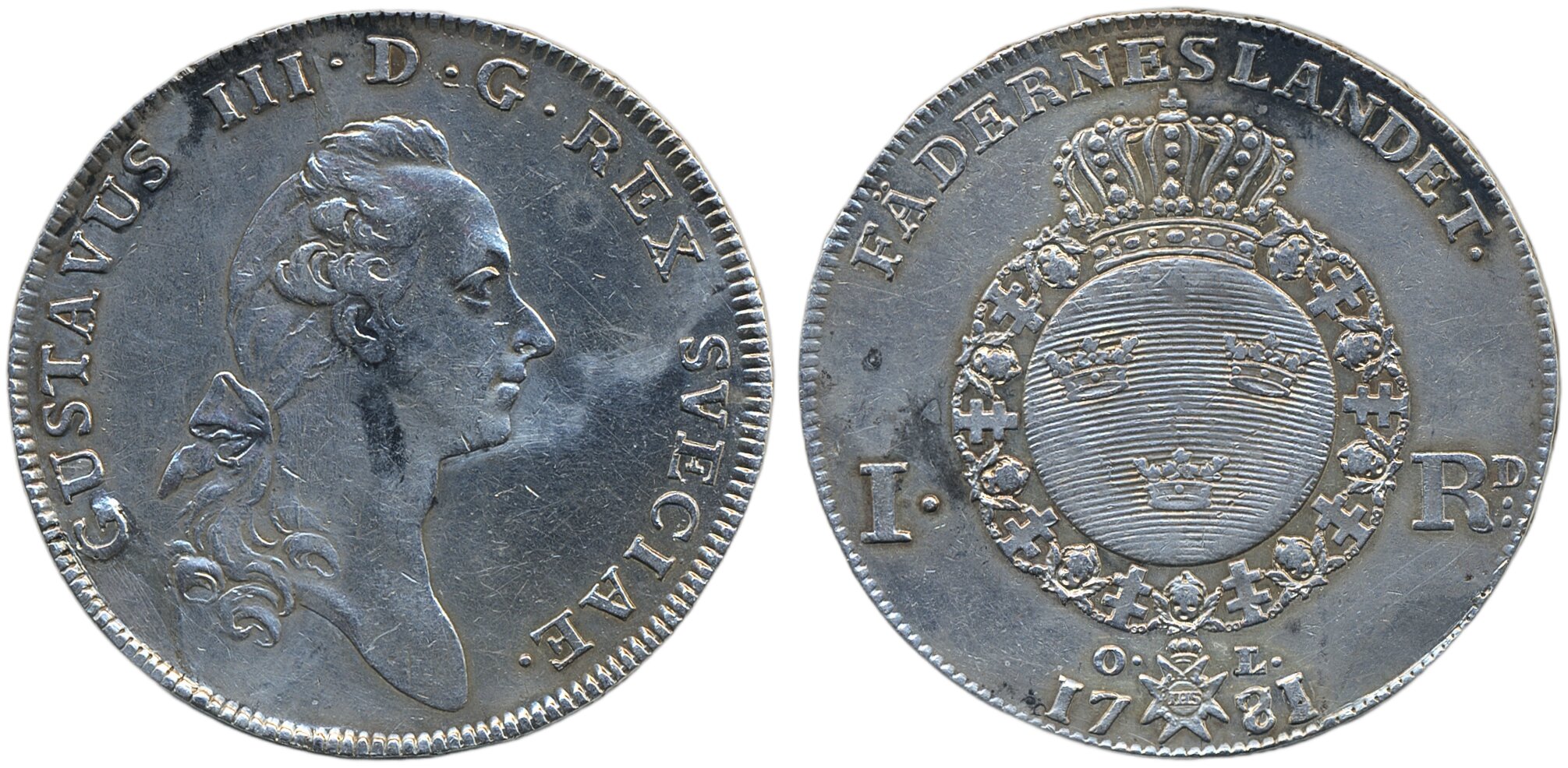 Coins, Sweden. Gustav III, SM 47a, 1 riksdaler 1781. 29.22 g. Stockholm. Cleaned. Tooled or mounted at 7 o'clock. 1+.