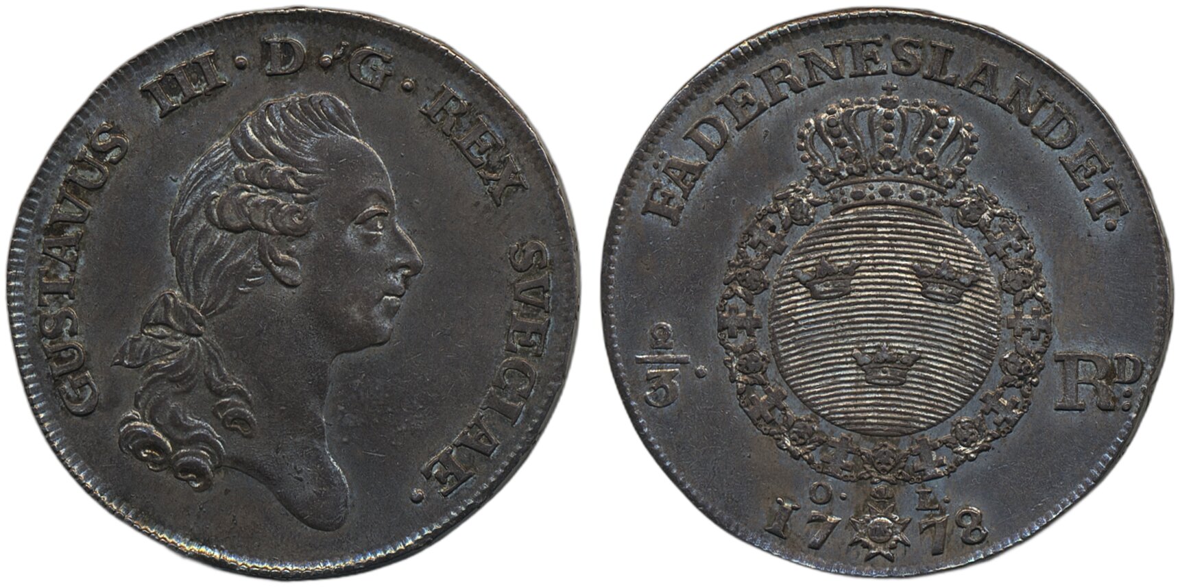 Coins, Sweden. Gustav III, SM 57, 2/3 riksdaler 1778. 19.45 g. Stockholm. Lustrous example with light toning, faint hairline scratch on reverse. Ex MISAB 16 lot 1212. 01.