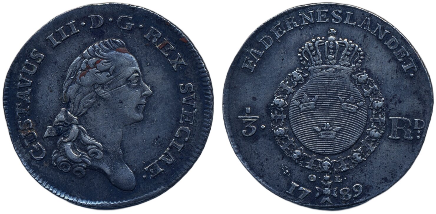Coins, Sweden. Gustav III, SM 73, 1/3 riksdaler 1789. 9.70 g. Stockholm. Minor obverse adjustment marks. 1+.