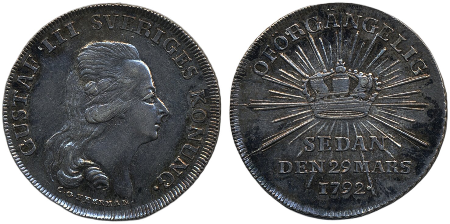 Coins, Sweden. Gustav III, SM 101, 1/3 riksdaler 1792. 9.72 g. Stockholm. Largesse money for the King's Funeral. 1+/01.
