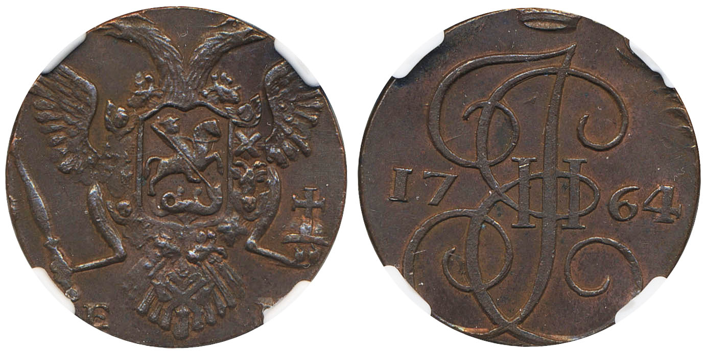 Coins, Sweden. Gustav III, SM 106 var, 5 kopeks 1764. 14.02 g. Avesta mint. Struck on planchet for 1 öre SM, smooth rim. Interesting imitative type struck during Gustav III war with Russia ca. 1787–1788. There are coins dated 1764, 1778 and 1787 of which the 1787-dated ones are by far most prevalent. This is the second recorded example struck on 1 öre SM planchet - the other one being in Avesta museum. It is unclear exactly why these were made, but presumably some form of trial pieces for the dies. Graded by NGC as MS62 BN. Bitkin 1286 (R3) var. RRRR. 01. See certification at NGC