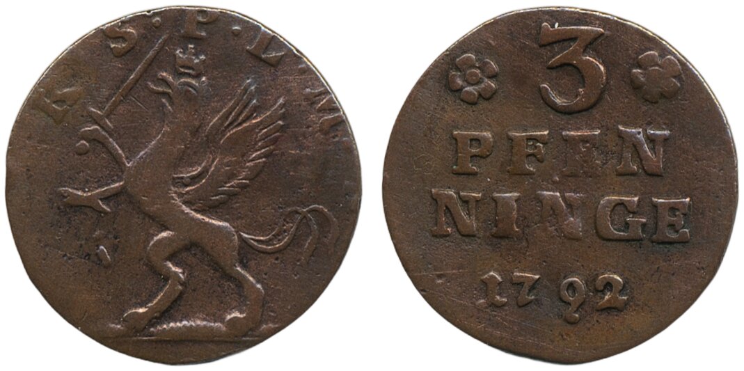 Coins, Swedish possessions, Pomerania. Gustav III, SB 266, 3 pfennig 1792. 2.60 g. 1/1+.
