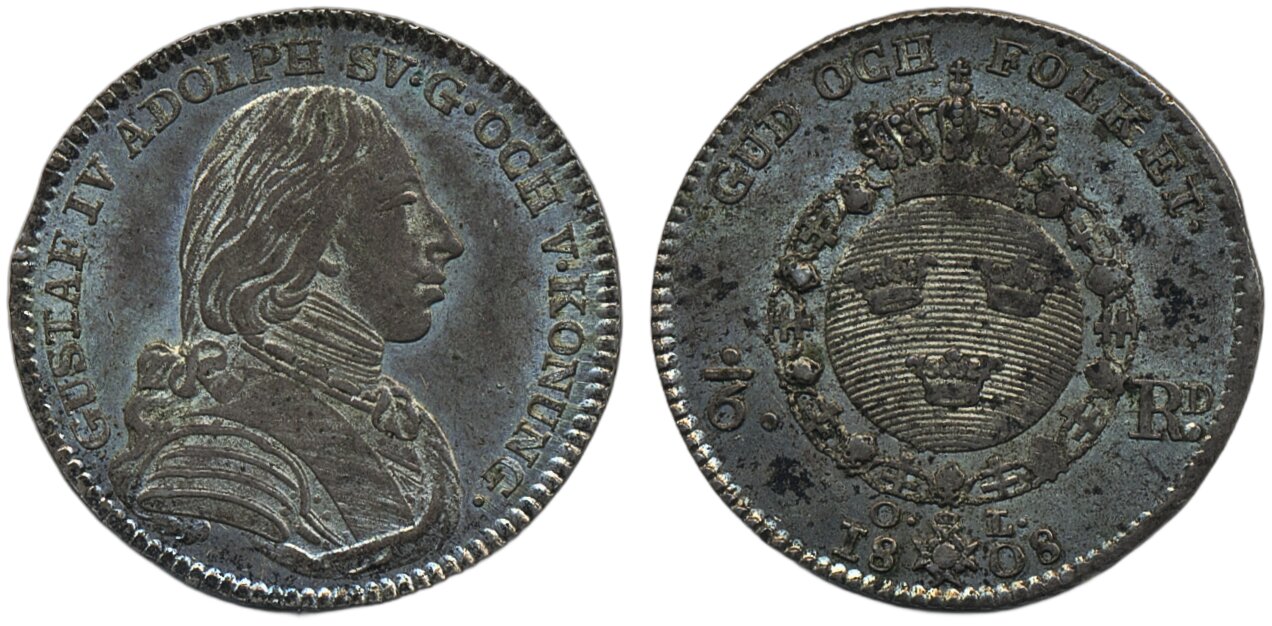 Coins, Sweden. Gustav IV Adolf, SM 43, 1/6 riksdaler 1808. 6.29 g. Stockholm. Lustrous example, minor edge clip from production. 01/0.