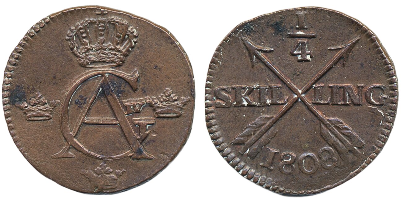 Coins, Sweden. Gustav IV Adolf, SM 62, 1/4 skilling 1808. 6.68 g. Avesta. Some red lustre. Minor spot. 01.