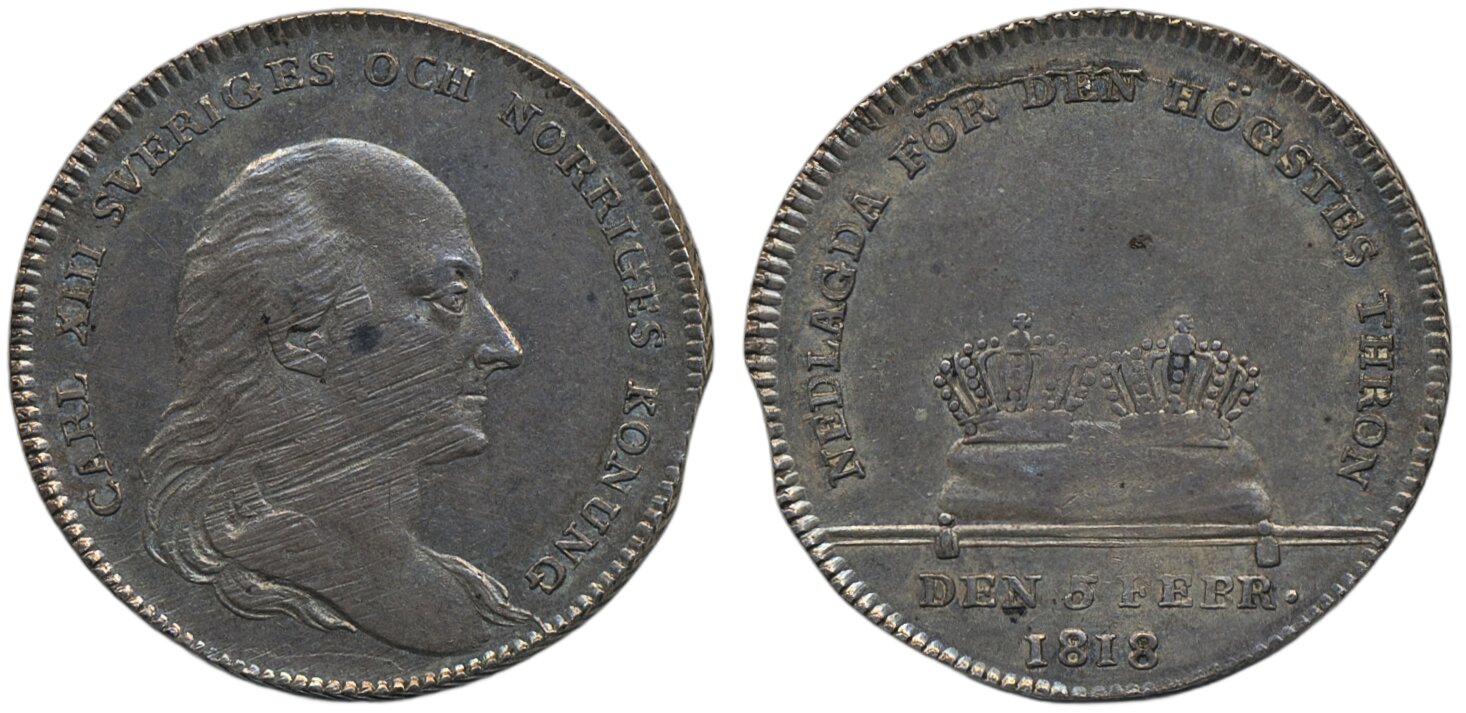Coins, Sweden. Karl XIII, SM 34b, 1/3 riksdaler 1818. 9.63 g. Stockholm. Partly weakly struck, adjustment marks. 1+/01.
