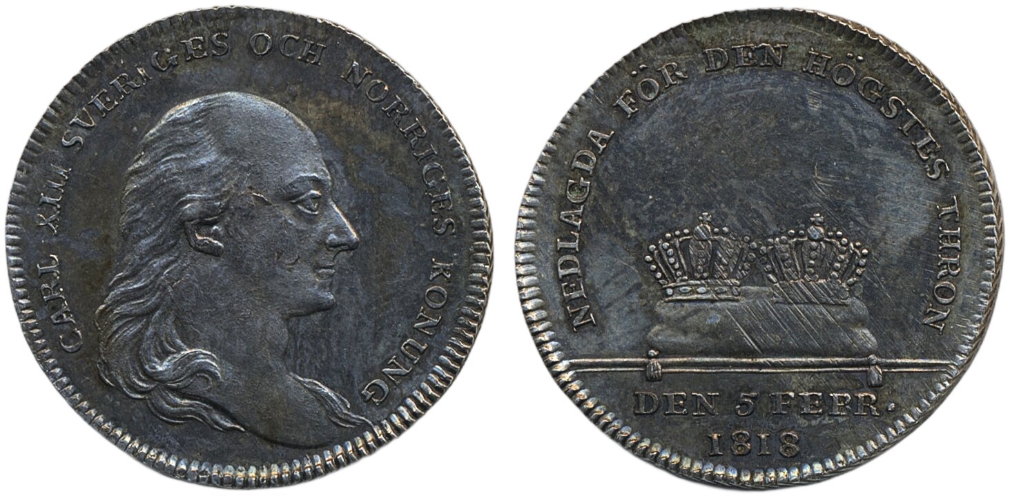 Coins, Sweden. Karl XIII, SM 34b var, 1/3 riksdaler 1818. 9.75 g. Stockholm. Largesse money to King's Funeral. Variety with hair at right shoulder – but different engraving/die than the illustrated on as SM 34b. Both the crowns on reverse are different and the bit of hair at the obverse shoulder. Interesting! 01.