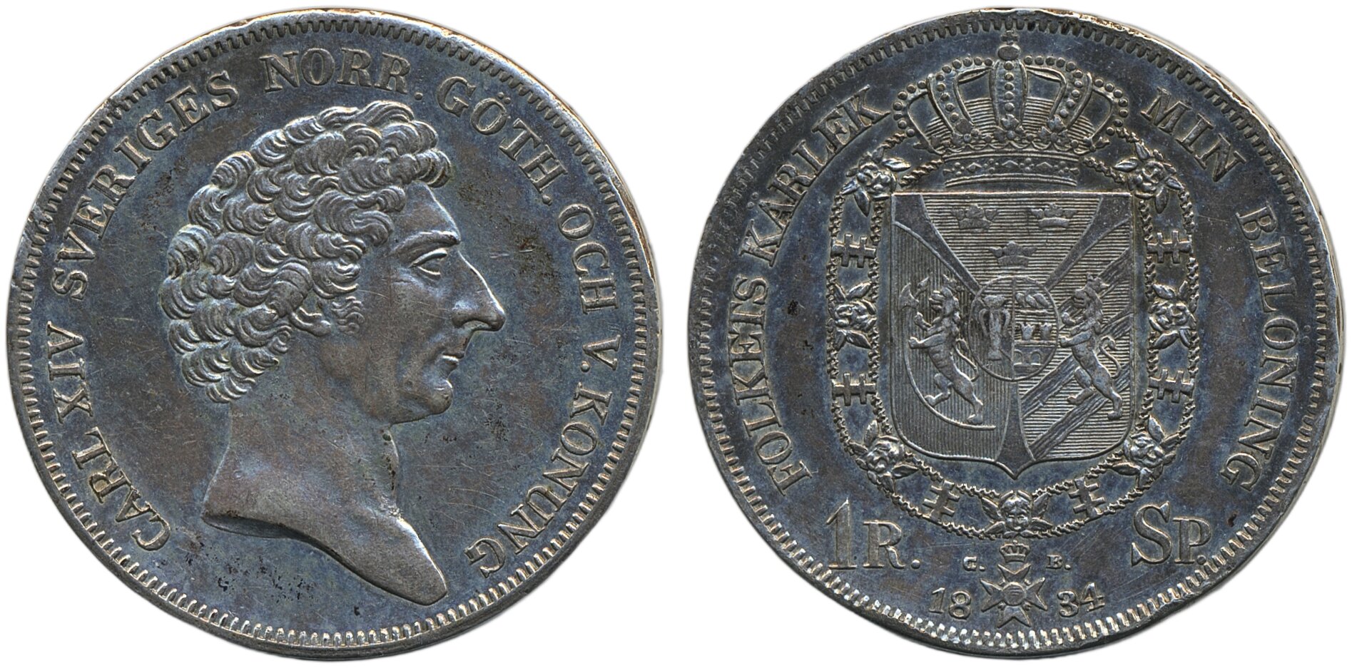 Coins, Sweden. Karl XIV Johan, SM 62, 1 riksdaler specie 1834. Lightly cleaned. 1+/01.