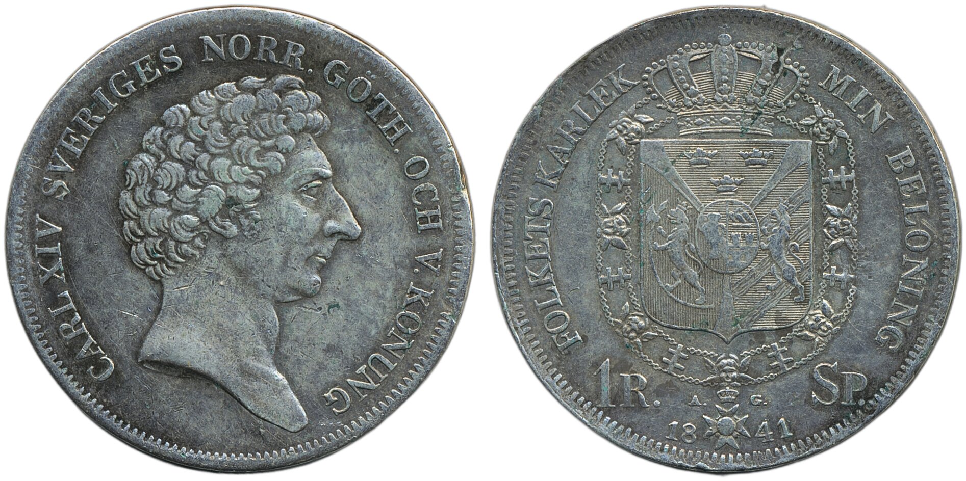 Coins, Sweden. Karl XIV Johan, SM 69, 1 riksdaler specie 1841. Cleaned. 1+.
