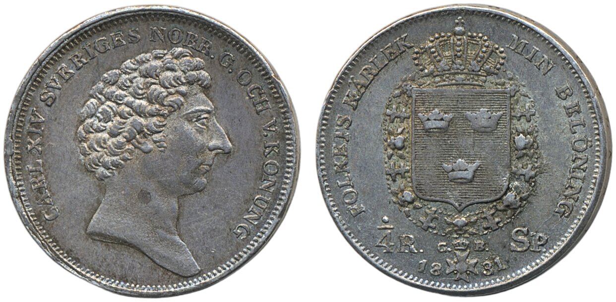 Coins, Sweden. Karl XIV Johan, SM 79, 1/4 riksdaler specie 1831. Lustrous attractive example. 01.