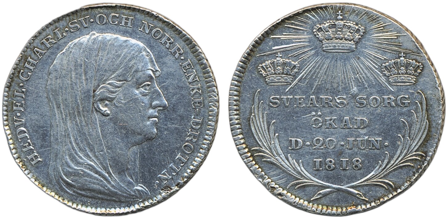 Coins, Sweden. Karl XIV Johan, SM 98, 1/3 riksdaler 1818. 9.82 g. Stockholm. Largesse money for the Queen Elizabet Charlotta's funeral. Cleaned. 1+.