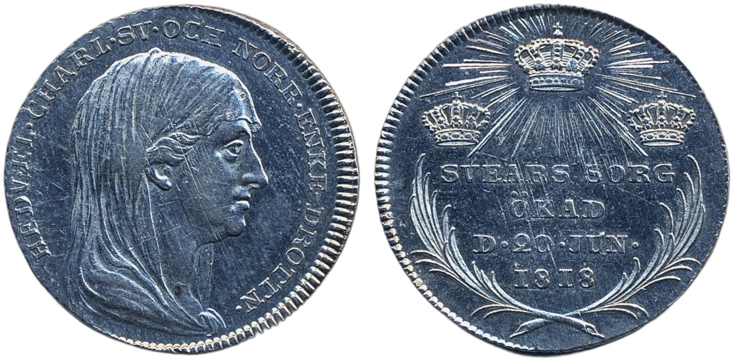 Coins, Sweden. Karl XIV Johan, SM 98, 1/3 riksdaler (largesse money) 1818. 9.70 g. Stockholm. Largesse money for funeral of Dowager Queen Hedvig Elisabet Charlotta. Cleaned. Minor adjustment marks. 1+/01.