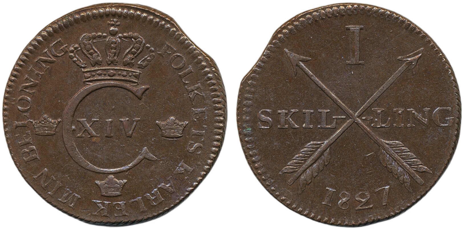 Coins, Sweden. Karl XIV Johan, SM 104, 1 skilling 1827. 19.07 g. Avesta. Beautiful lustrous example, minor edge clip from production. 01/0.