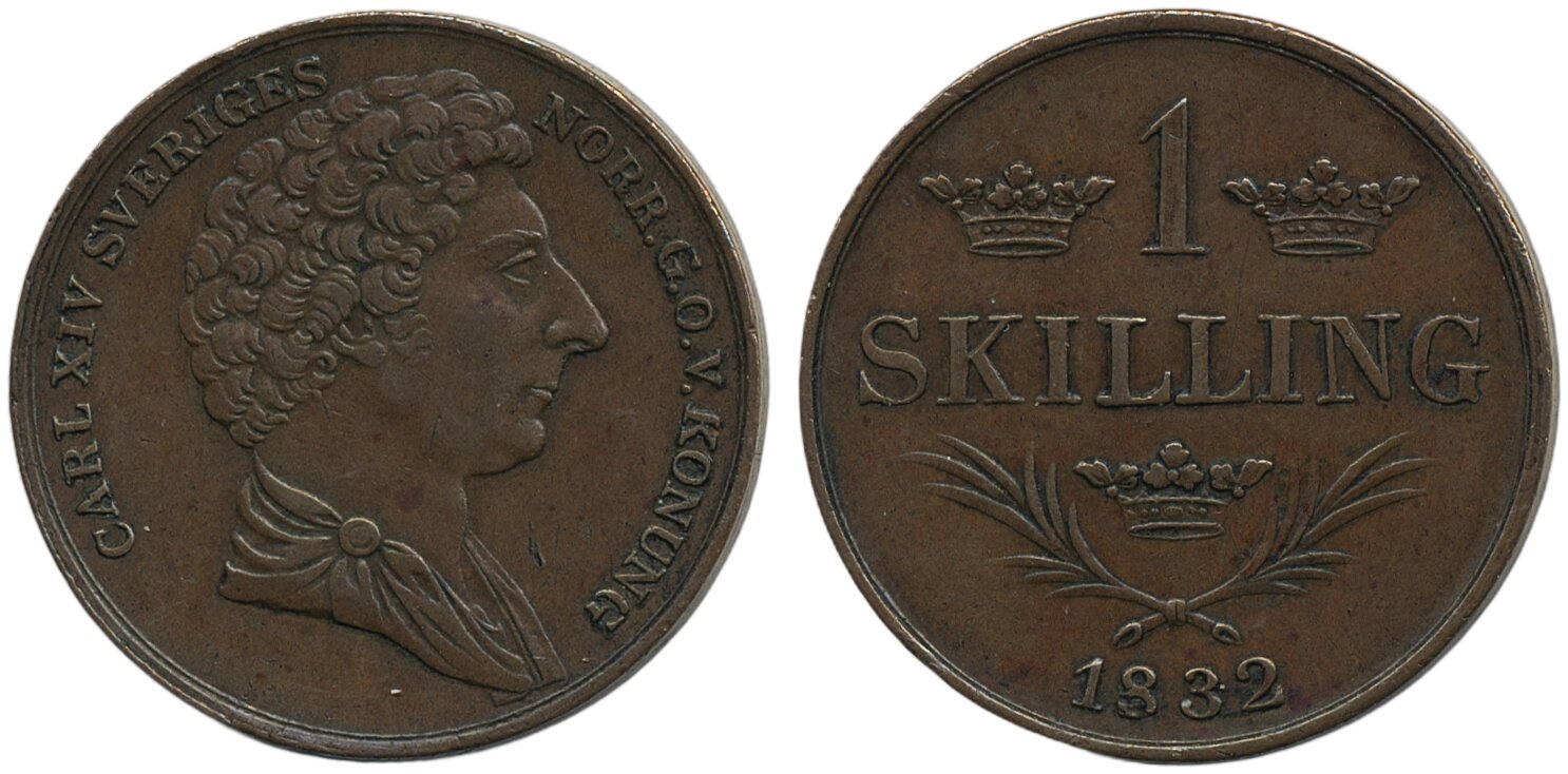 Coins, Sweden. Karl XIV Johan, SM 130, 1 skilling 1832. 15.90 g. 1+.