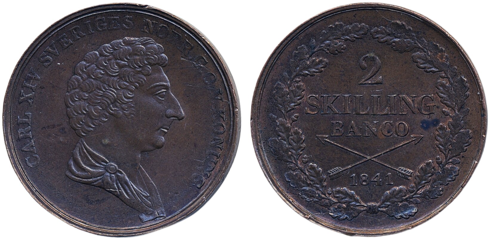 Coins, Sweden. Karl XIV Johan, SM 143, 2 skilling banco 1841. Beautiful example with some lustre. 01.
