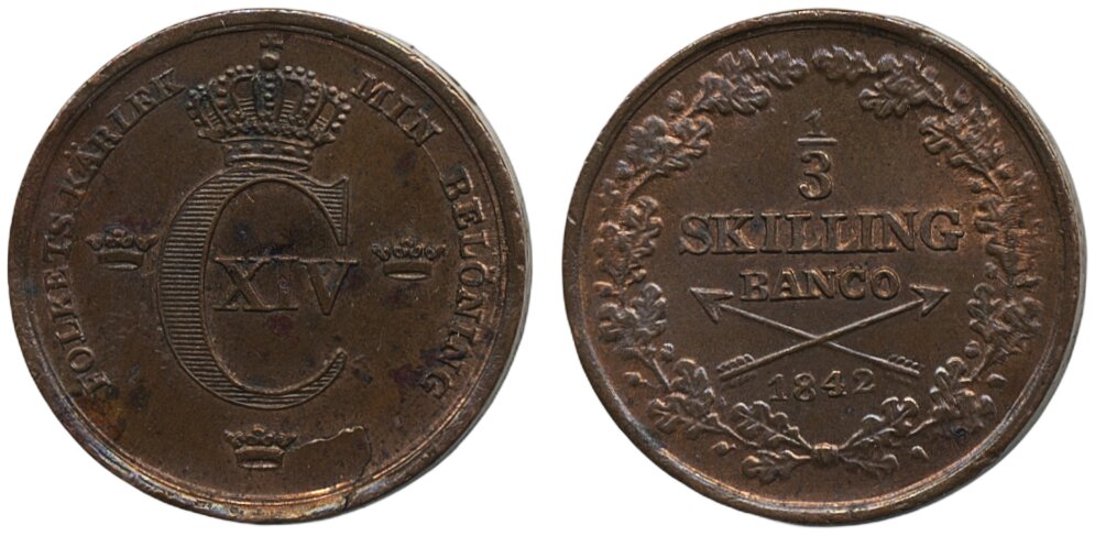Coins, Sweden. Karl XIV Johan, SM 168, 1/3 skilling banco 1842. Lustrous example. 01/0.