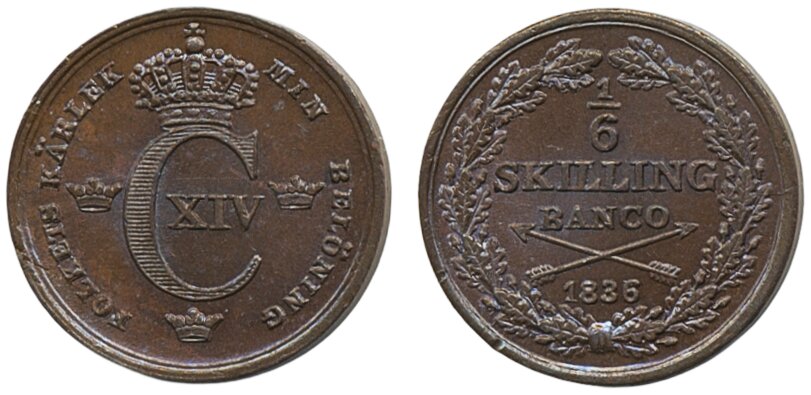 Coins, Sweden. Karl XIV Johan, SM 171, 1/6 skilling banco 1836. Lustrous and beautiful example. 01/0.
