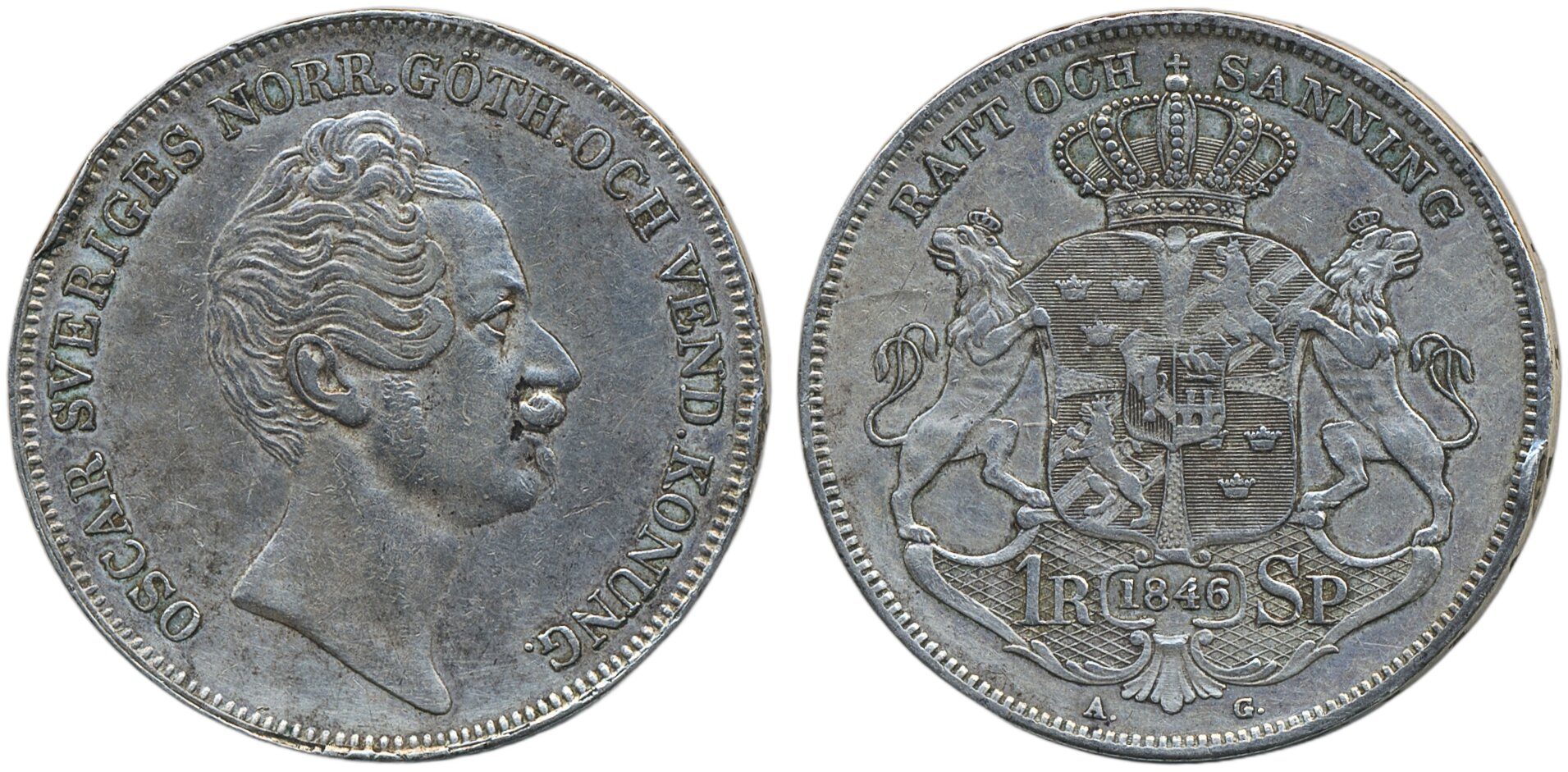 Coins, Sweden. Oskar I, SM 27, 1 riksdaler specie 1846. Edge nicks. 1/1+.