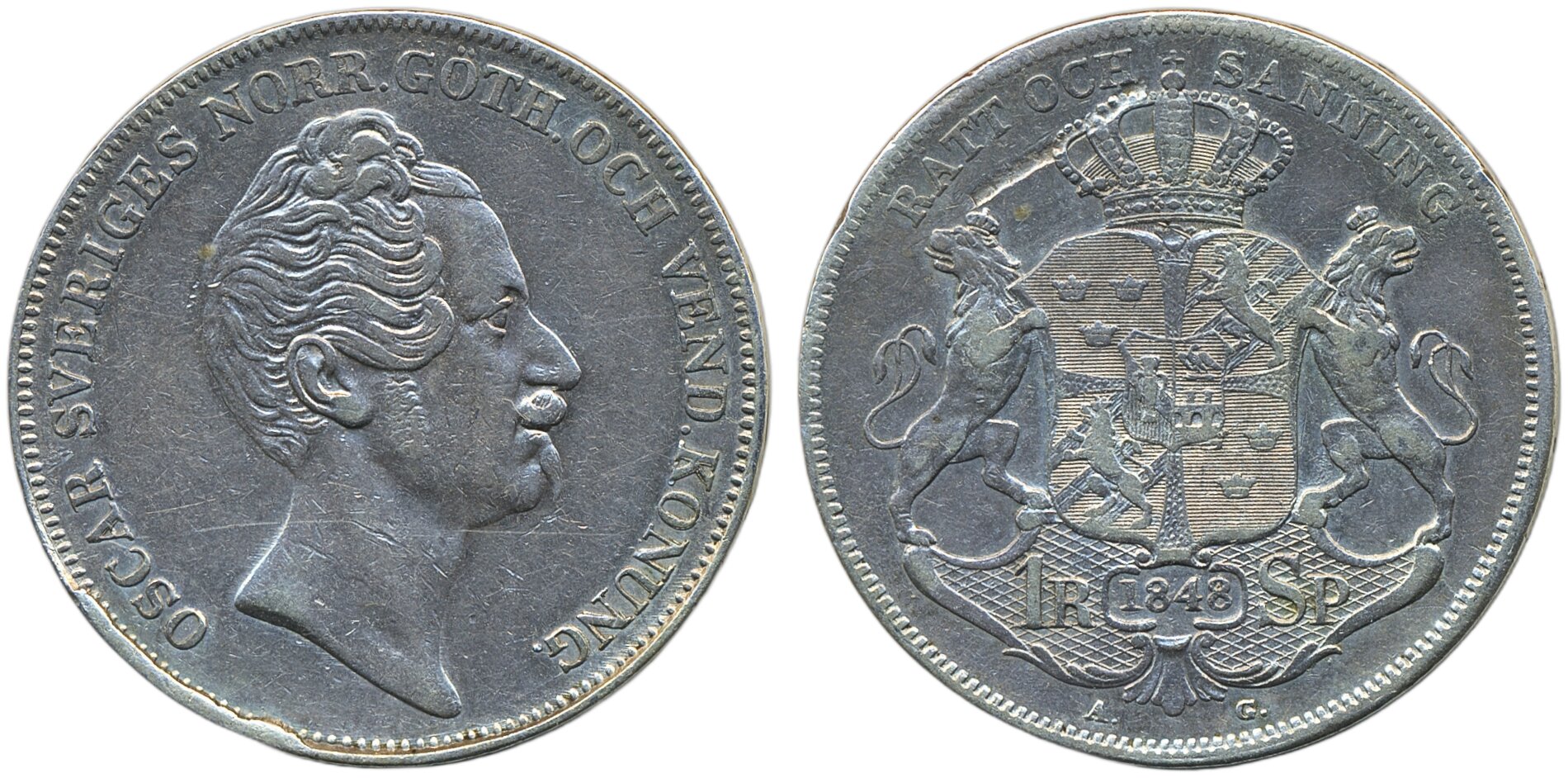 Coins, Sweden. Oskar I, SM 29, 1 riksdaler specie 1848. Planchet flaw on reverse. 1+.