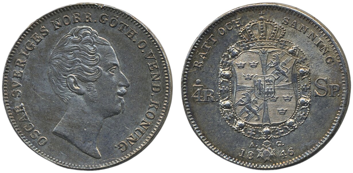 Coins, Sweden. Oskar I, SM 40, 1/4 riksdaler specie 1846. 01.