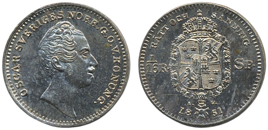 Coins, Sweden. Oskar I, SM 49, 1/16 riksdaler specie 1851. Good 01.