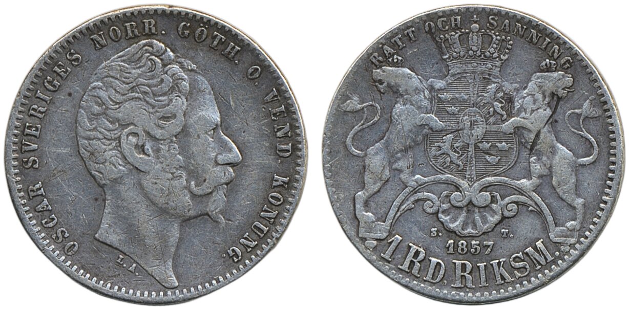 Coins, Sweden. Oskar I, SM 60b, 1 riksdaler riksmynt 1857. Scratch on reverse. 1.