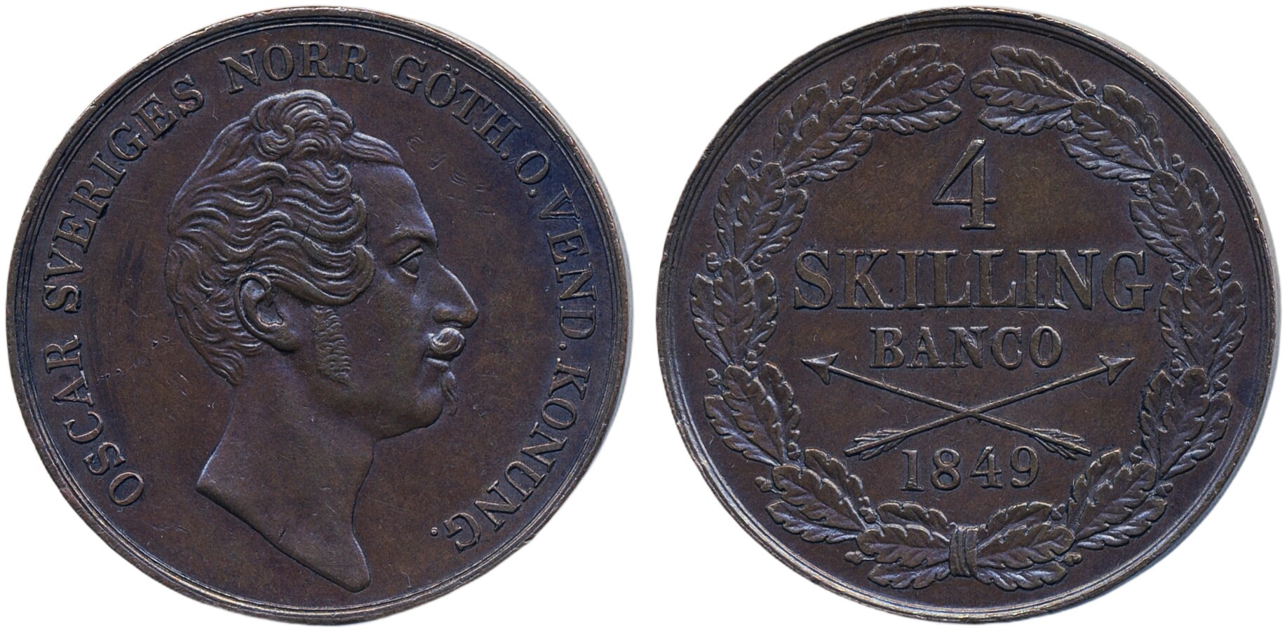 Coins, Sweden. Oskar I, SM 71, 4 skilling banco 1849. 1+/01.