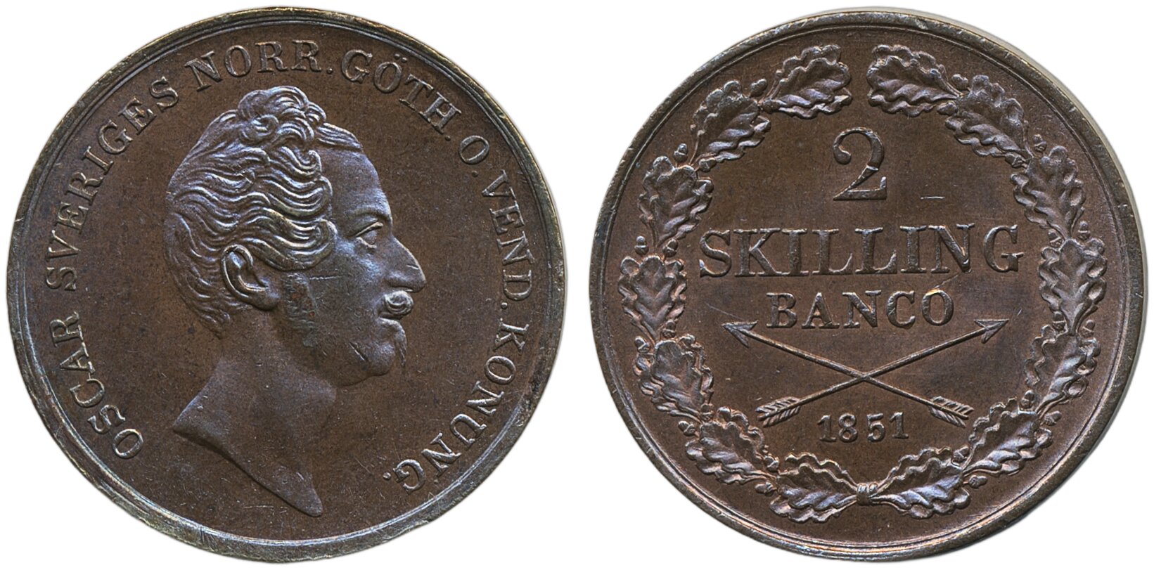 Coins, Sweden. Oskar I, SM 83, 2 skilling banco 1851. Beautiful example with almost full lustre. 01/0.