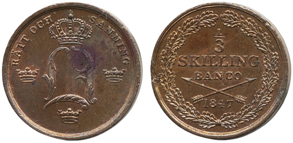 Coins, Sweden. Oskar I, SM 113, 1/3 skilling banco 1847. 01/0.