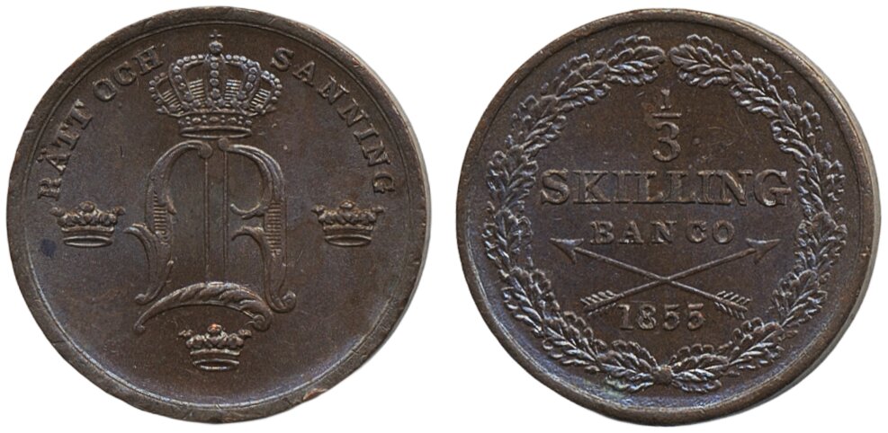 Coins, Sweden. Oskar I, SM 120, 1/3 skilling banco 1855. 01/0.