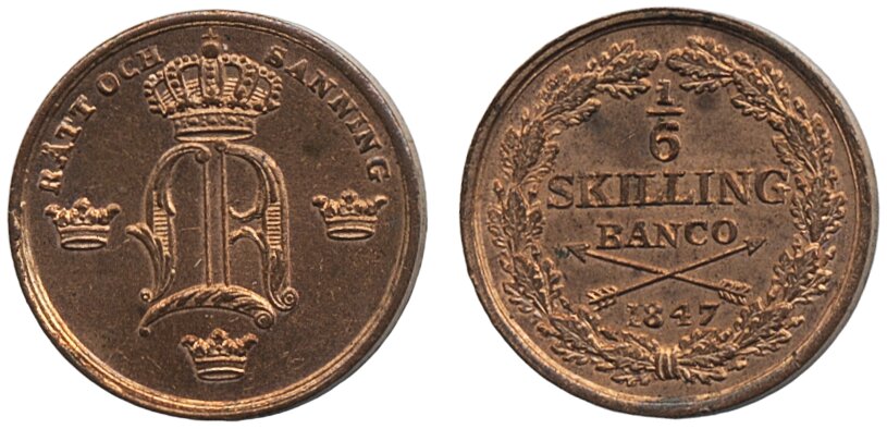 Coins, Sweden. Oskar I, SM 124, 1/6 skilling banco 1847. Much red lustre. 01/0.