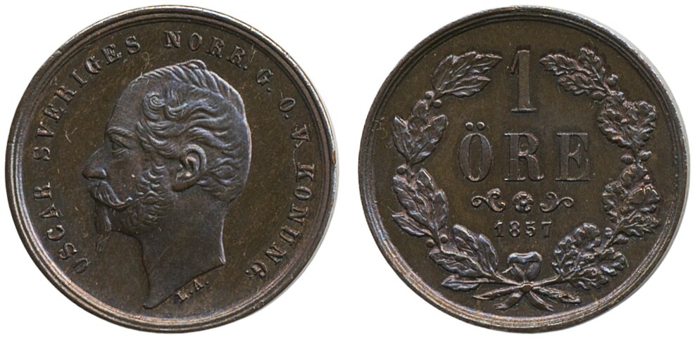 Coins, Sweden. Oskar I, SM 138, 1 öre 1857. 01/0.