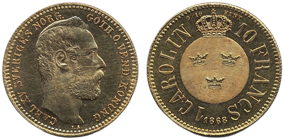 Coins, Sweden. Karl XV, SM 10, 1 carolin 1868. 1+/01.