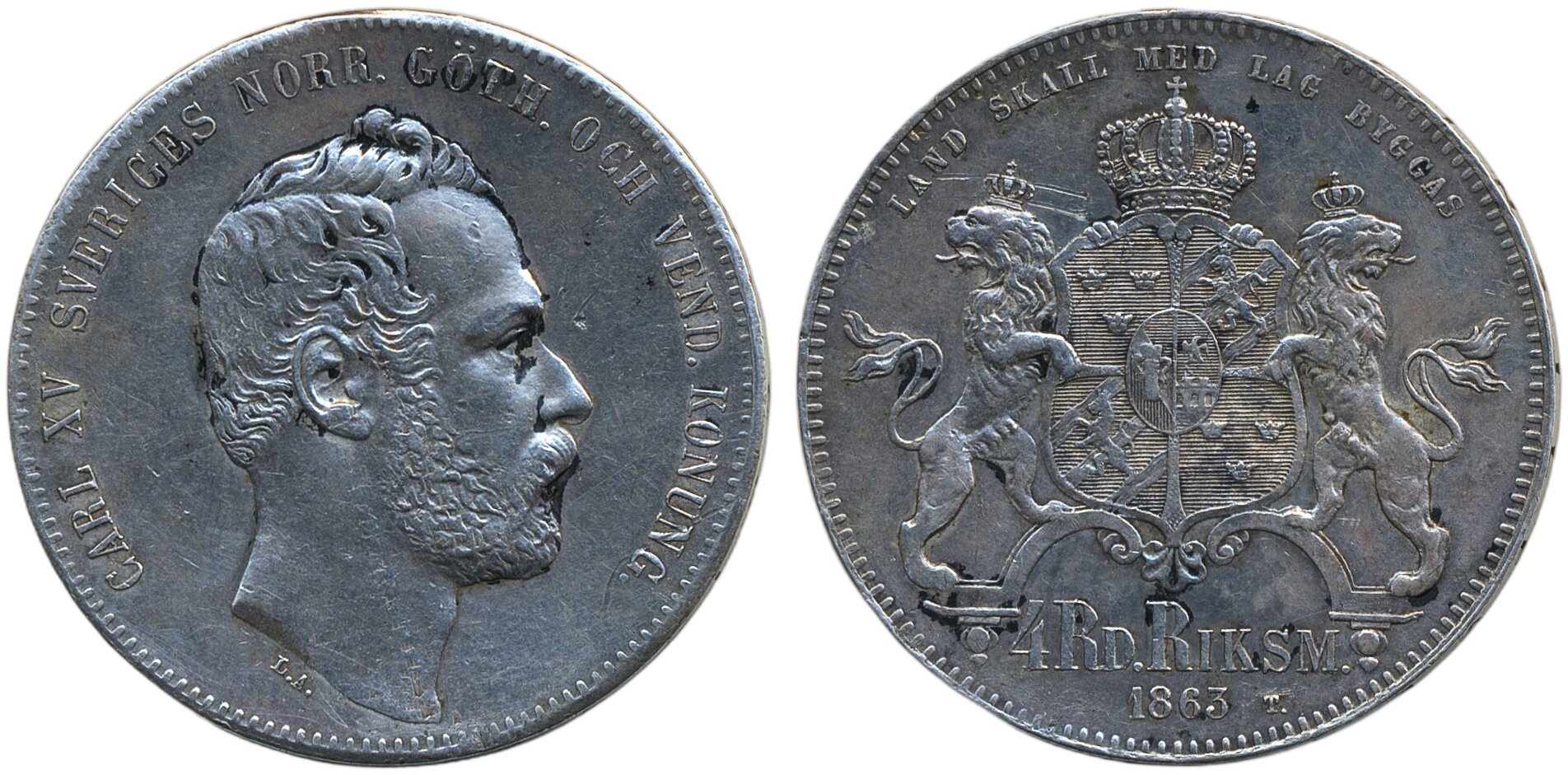 Coins, Sweden. Karl XV, SM 16, 4 riksdaler riksmynt 1863. Cleaned, small scratches on reverse. 1/1+.