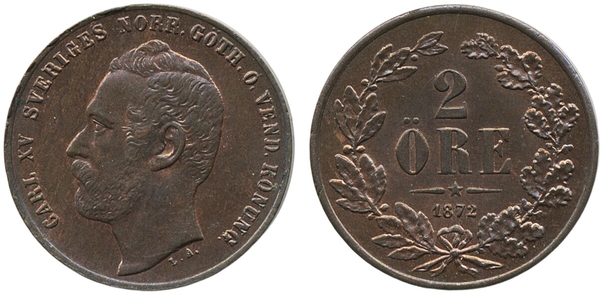 Coins, Sweden. Karl XV, SM 69, 2 öre 1872. 01/0.