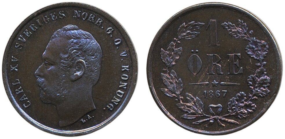 Coins, Sweden. Karl XV, SM 77, 1 öre 1867. Beautiful example with mirror-like surfaces. 0.