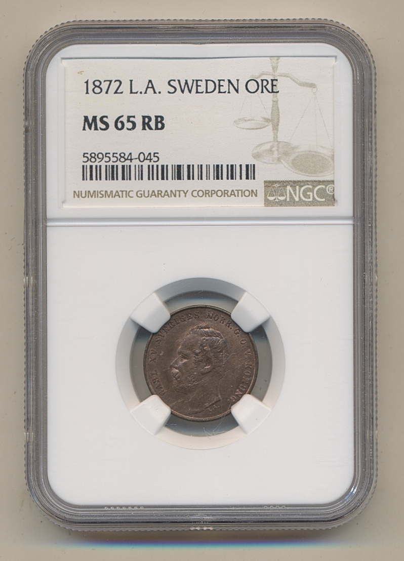 Coins, Sweden. Karl XV, SM 80, 1 öre 1872. Graded as MS65 RB by NGC. 01/0. See certification at NGC
