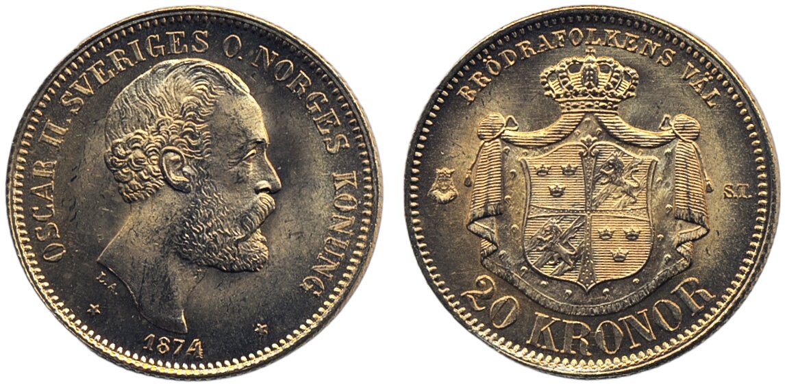Coins, Sweden. Oskar II, MIS I.4b, 20 kronor 1874. 01.