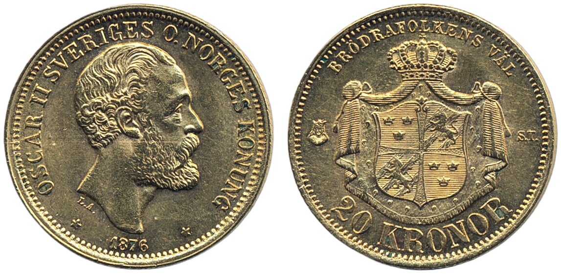 Coins, Sweden. Oskar II, MIS I.8, 20 kronor 1876. Without shield. 01.