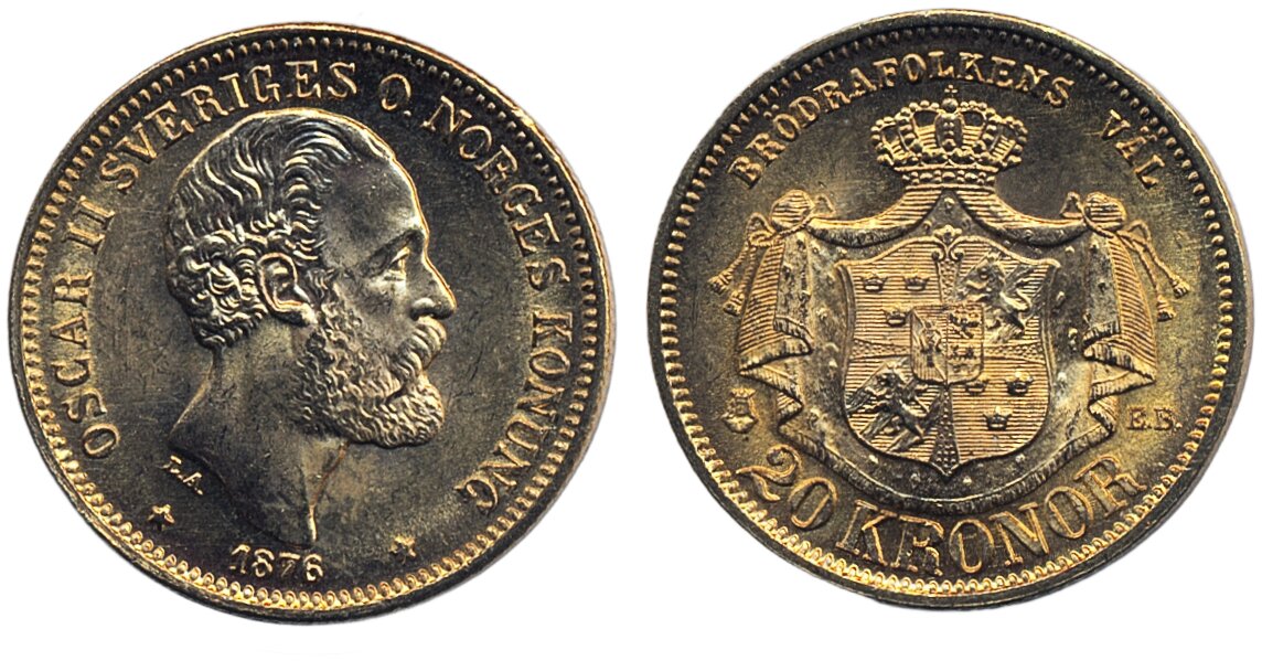 Coins, Sweden. Oskar II, MIS II.1, 20 kronor 1876. 01/0.