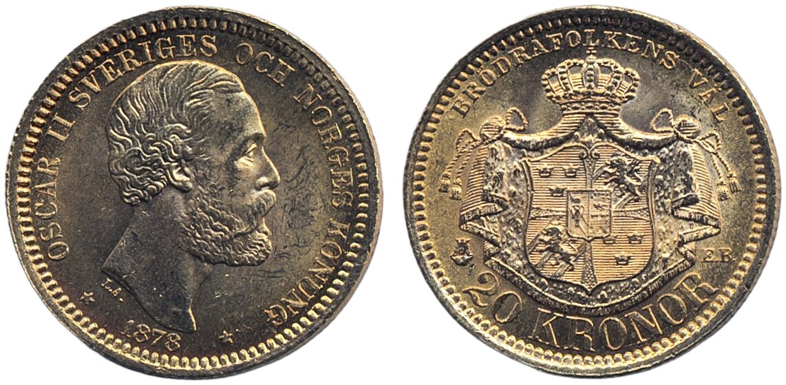 Coins, Sweden. Oskar II, MIS III.2b, 20 kronor 1878. 01.