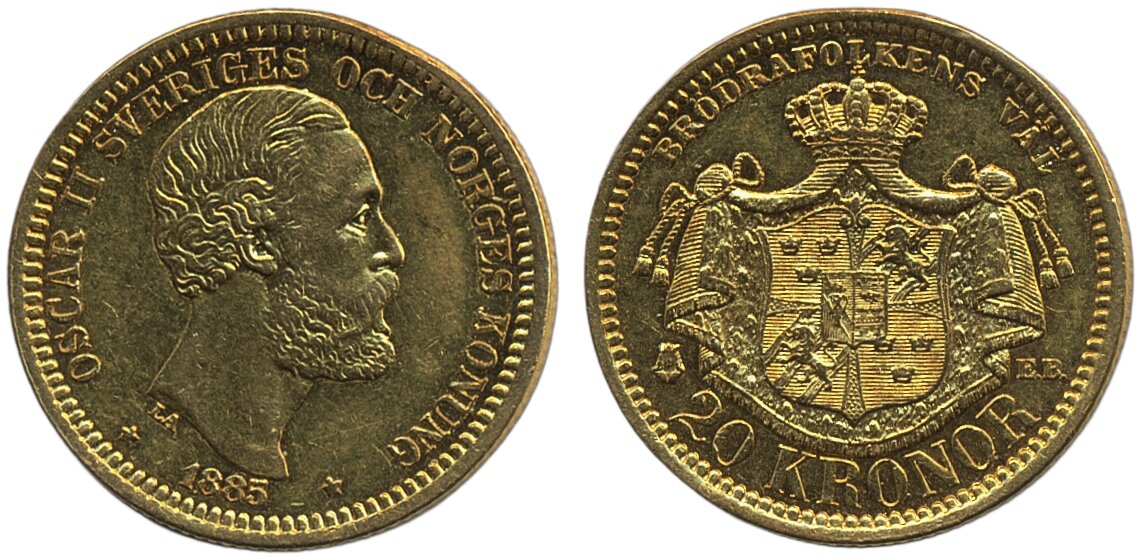 Coins, Sweden. Oskar II, MIS III.7, 20 kronor 1885. Has been mounted. 1+.