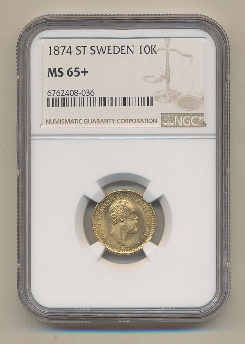 Coins, Sweden. Oskar II, MIS I.2b, 10 kronor 1874. Superb specimen. Graded MS65+ by NGC. SM 25a. SG 29. 01/0. See certification at NGC