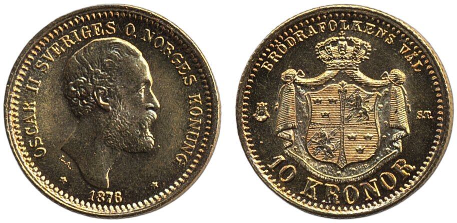 Coins, Sweden. Oskar II, MIS I.4, 10 kronor 1876. Without heart shield. 01/0.