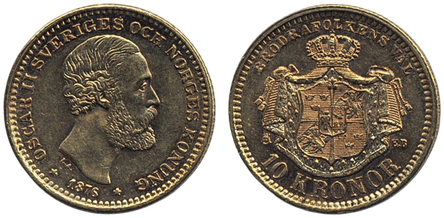 Coins, Sweden. Oskar II, MIS II.1, 10 kronor 1876. With OCH in legend. 1+/01.