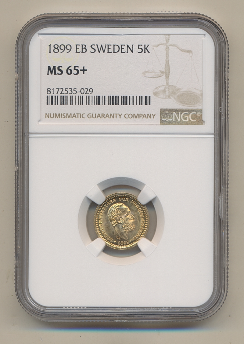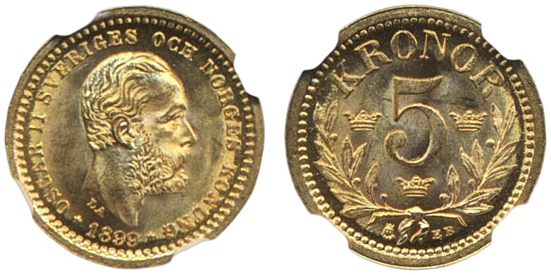 Coins, Sweden. Oskar II, MIS I.6, 5 kronor 1899. Graded by NGC as MS65+. SM 39. SG 50. 01/0. See certification at NGC