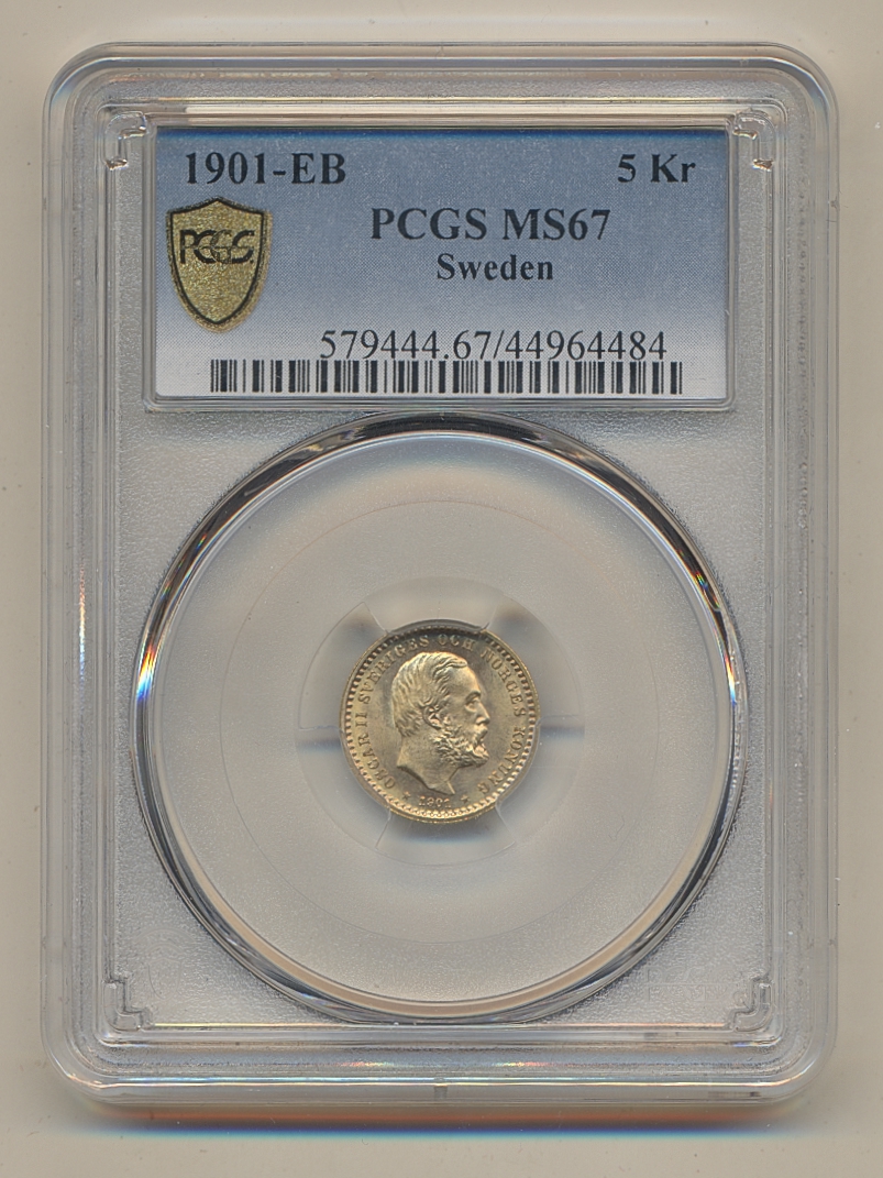 Coins, Sweden. Oskar II, MIS IIa, 5 kronor 1901. Graded by PCGS as MS67. Tied finest graded by PCGS. 0. See certification at PCGS