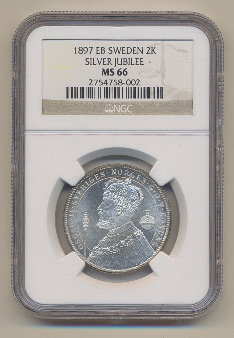 Coins, Sweden. Oskar II, MIS IV, 2 kronor 1897. Graded by NGC as MS66. 0. See certification at NGC