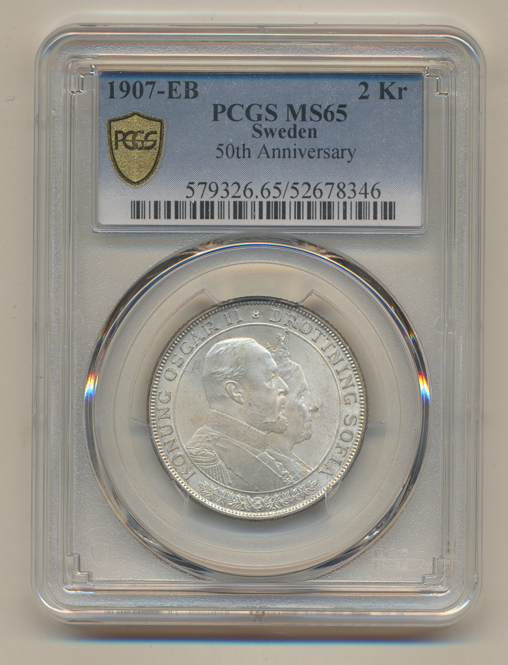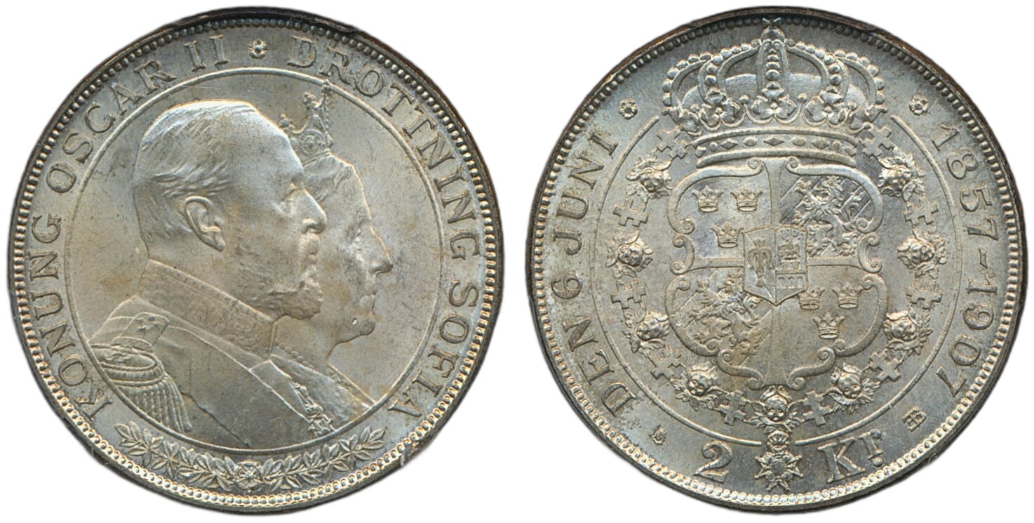 Coins, Sweden. Oskar II, MIS VI, 2 kronor 1907. Graded by PCGS as MS65. 01/0. See certification at PCGS