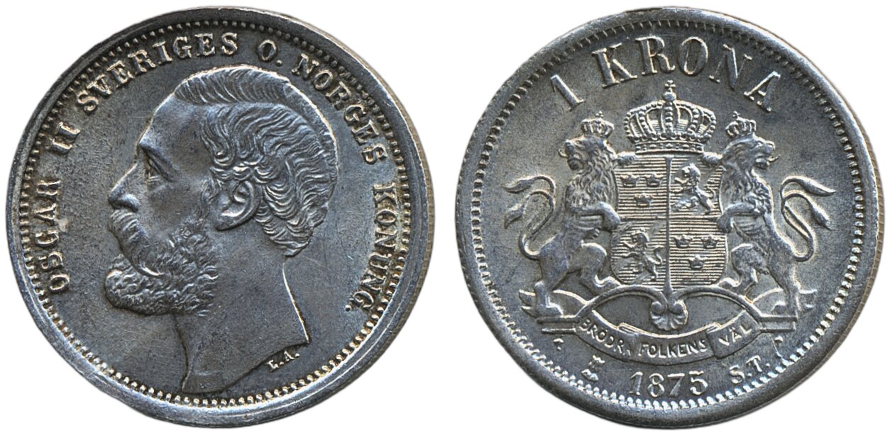 Coins, Sweden. Oskar II, MIS I.1, 1 krona 1875. Superb lustrous example with light toning on obverse. 01/0.