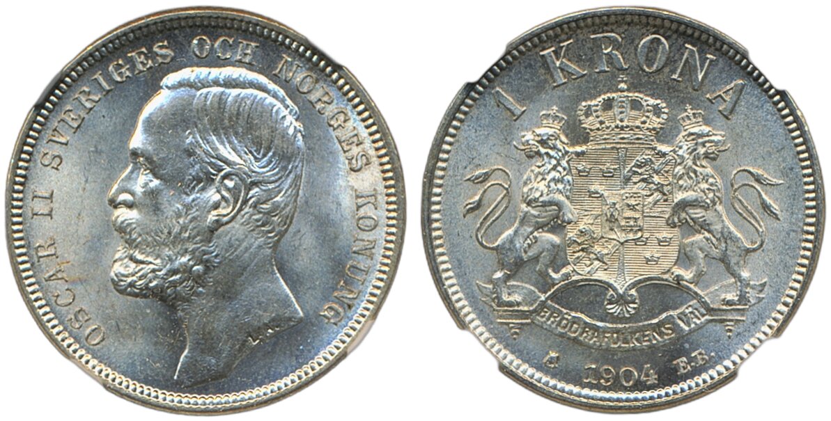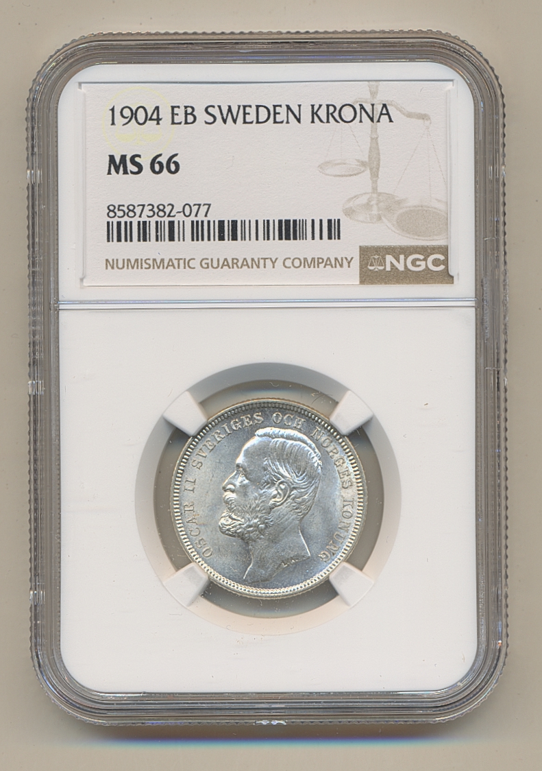 Coins, Sweden. Oskar II, SM 78, 1 krona 1904. Graded by NGC as MS66. A beautiful example. 0. See certification at NGC